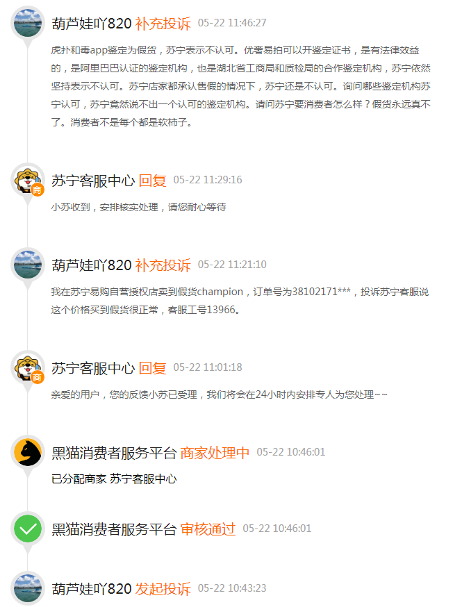 消費(fèi)者“葫蘆娃吖820”在5月22日向黑貓投訴平臺(tái)再次反映:“我在蘇寧易購自營授權(quán)店賣到假貨champion,訂單號(hào)為38102171***,投訴蘇寧客服說這個(gè)價(jià)格買到假貨很正常,客服工號(hào)13966。”
