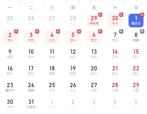 具體如下:9月29日至10月6日放假調休,共8天。10月7日(星期六)、10月8日(星期日)上班。