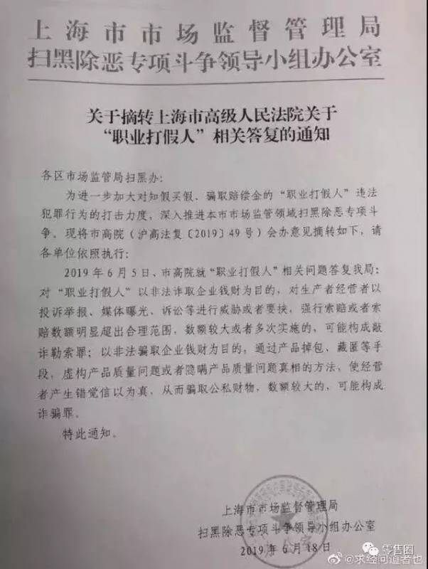 為此,上海市將“職業(yè)打假人”列入掃黑除惡范圍,對各類商品交易市場中欺行霸市、強買強賣、收保護費的“市霸”“行霸”以及知假買假、騙取賠償金的“職業(yè)打假人”等涉黑涉惡行為進行重點打擊。特別指出要重點排查以滋擾、糾纏、哄鬧、聚眾造勢等方式騙取經(jīng)營者錢財涉嫌敲詐勒索、尋釁滋事的“職業(yè)打假人”。