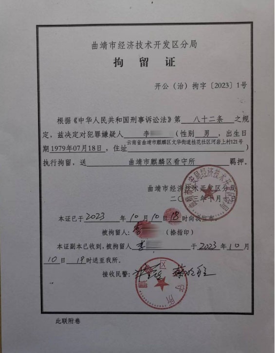 10 日決定對犯罪嫌疑人李某予以刑事拘留。拘留證:開公(治)拘字(2023)