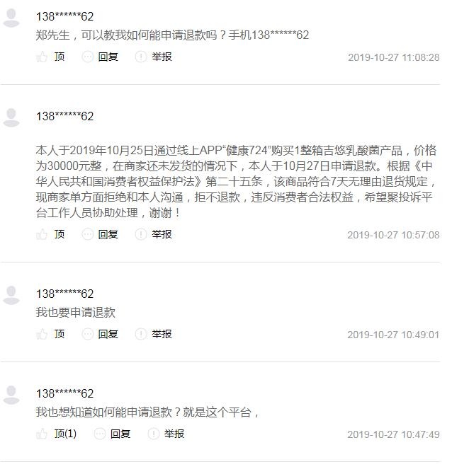 本人于2019年4月19日通過線上APP“健康724”購買1整箱吉悠乳酸菌產(chǎn)品,價格為2980元整,商家以供貨不足為由拖延發(fā)貨,在商家還未發(fā)貨的情況下,本人于4月22日申請退款。根據(jù)《中華人民共和國消費者權益保護法》第二十五條,該商品符合7天無理由退貨規(guī)定,現(xiàn)商家單方面拒絕和本人溝通,拒不退款,違反消費者合法權益,希望聚投訴平臺工作人員協(xié)助處理,謝謝!