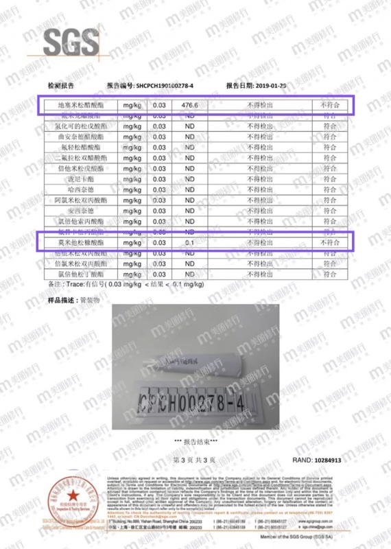 檢出200.2mg/kg莫米他松糠酸酯,3mg/kg氯倍他索丙酸酯。莫米他松糠酸酯含量為藥品1/5。