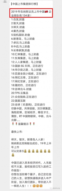 凡是通過(guò)微信群等方式向“非特定公眾”進(jìn)行所謂“原始股募資”的企業(yè),沒(méi)有一家真正在主流市場(chǎng)(如納斯達(dá)克、紐交所、港交所、滬深等)上市!而上市的企業(yè),對(duì)于只知道微信群消息的“家人”來(lái)說(shuō),可能從來(lái)沒(méi)有聽說(shuō)過(guò)!