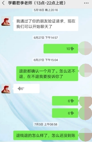 因退款超過(guò)了退費(fèi)通知約定的日期,周女士多次詢(xún)問(wèn)學(xué)霸君退費(fèi)一事,但班主任不予理睬,客服態(tài)度冷漠。周女士表示,在等待退款期間,盡管工作很忙,也不得不抽空去找學(xué)霸君詢(xún)問(wèn),并找12315、黑貓投訴、聚投訴等平臺(tái)進(jìn)行投訴。