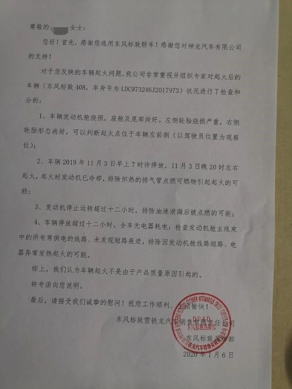 起火事故發(fā)生后,東風標致廠家派出技術人員對房女士的汽車進行現(xiàn)場鑒定工作。今年1月6日,東風標致雪鐵龍汽車銷售有限責任公司就房女士汽車起火的問題出具了一份情況說明,該說明指出“排除熾熱的排氣管點燃可燃物引起火災的可能”“排除油液泄露后被點燃的可能”“排除因發(fā)動機艙線路短路、電器異常發(fā)熱起火的可能”,認為“車輛起火不是由于產(chǎn)品質(zhì)量原因引起”。