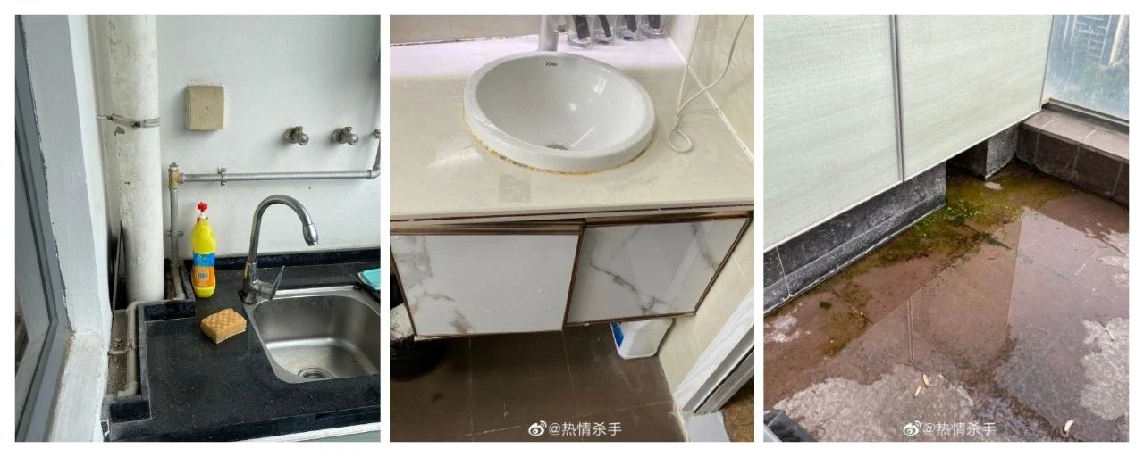 小君表示,到達(dá)民宿后第一感受就是噪音巨大,因?yàn)橐唤种艟褪谴笮褪┕すさ兀欢趷郾擞脑斍轫撁胬?,以及入住前與房東的私信溝通中,均未提及這一情況。另外,房間內(nèi)有多處污漬,衛(wèi)生間和廚房污垢厚重,陽臺(tái)的積水發(fā)臭難聞,甚至長出了一灘青苔,夜晚睡覺的時(shí)候與蟲共舞……而如此嘈雜臟亂的民宿,一晚需要接近1500元。