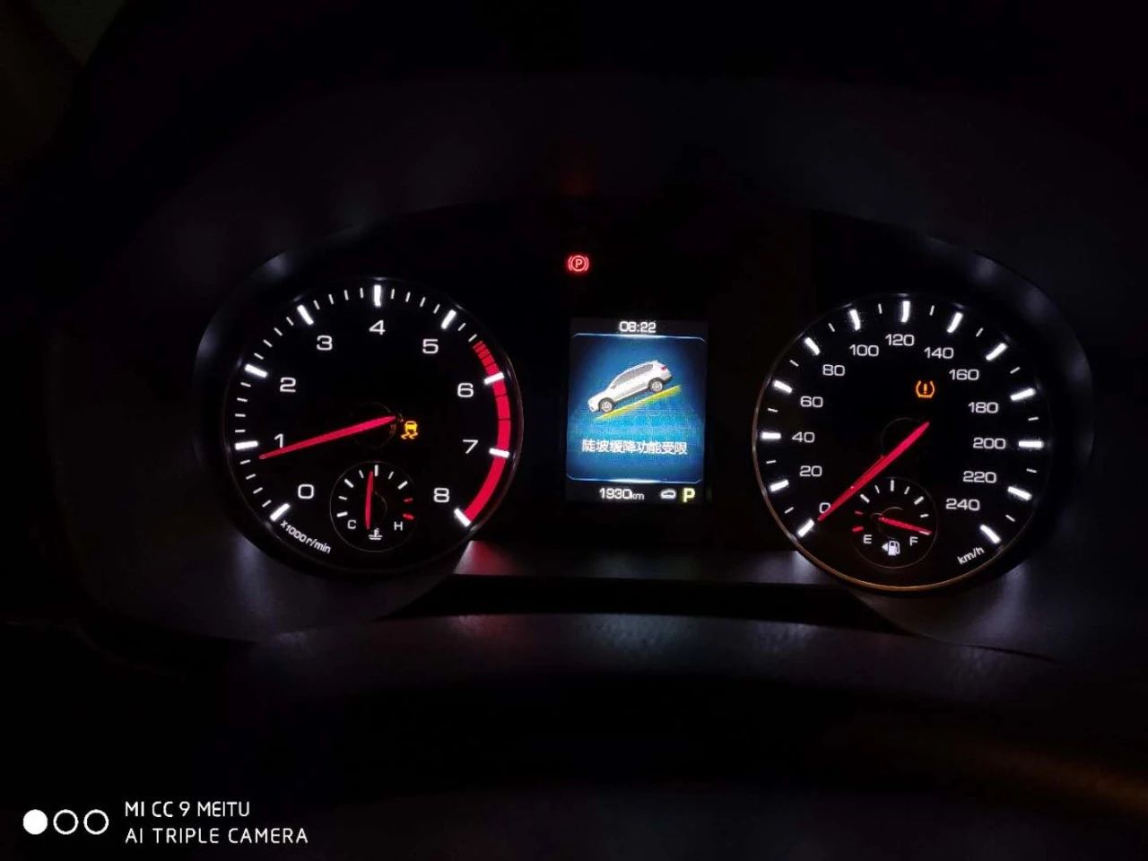 ▲汽車儀表盤提示陡坡緩降功能受限