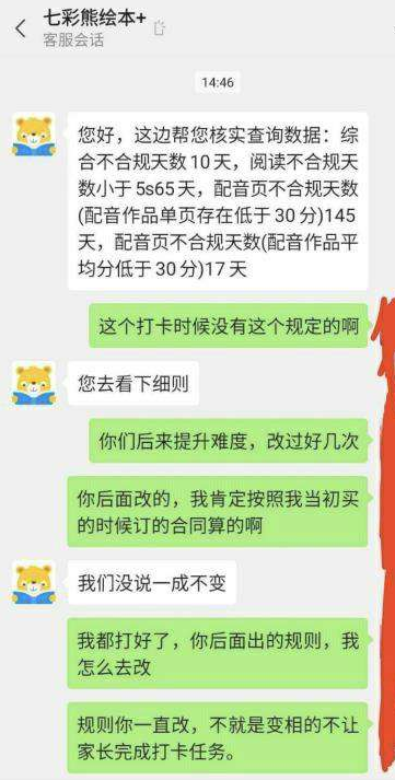 更讓家長們不滿的是,隨著App一次又一次地升級改版,打卡任務(wù)難度也越來越大。從家長們提供的資料來看,打卡已經(jīng)背離了讓孩子快樂學(xué)習(xí)的初衷。而完成不了打卡任務(wù),也無疑會直接影響到家長用戶們最終的課程返現(xiàn)。在《消費者報道》的采訪過程中,多名家長認為,“七彩熊”單方面修改課程打卡規(guī)則,增加課程學(xué)習(xí)難度和打卡難度,對那些一直按要求堅持學(xué)習(xí)打卡的用戶而言,其實是變相設(shè)置障礙。
