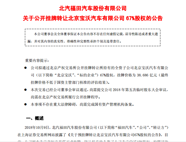 ▲北汽福田汽車轉(zhuǎn)讓寶沃汽車67%的股份