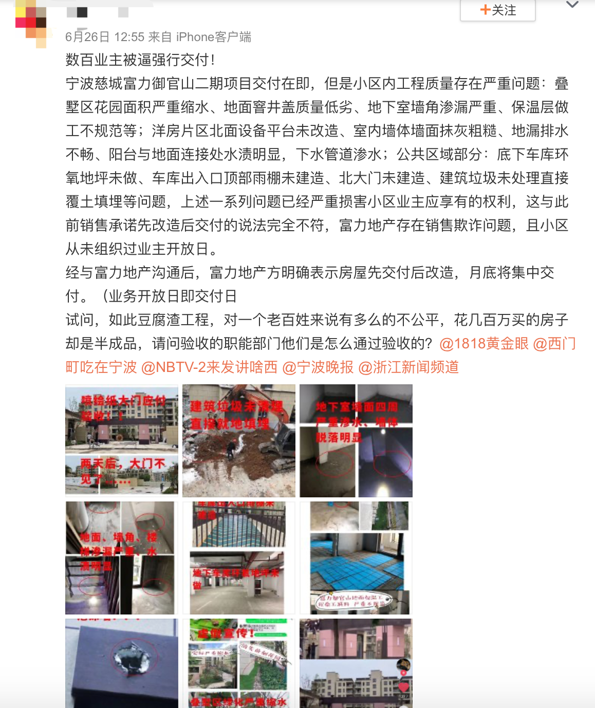 被投訴的樓盤包括菏澤富力城、湖州富力尚城小區(qū)、阜陽潁上縣富力城、韶關(guān)富力城市花園、長沙富力十號、南昌富力金禧悅城、寧波慈城富力御官山、東營富力鉑悅府、成都富力桃園、呼和浩特富力城、無錫富力城、重慶富力城和太原富力灣。富力地產(chǎn)屢屢被推上風(fēng)口浪尖,深陷質(zhì)量門。