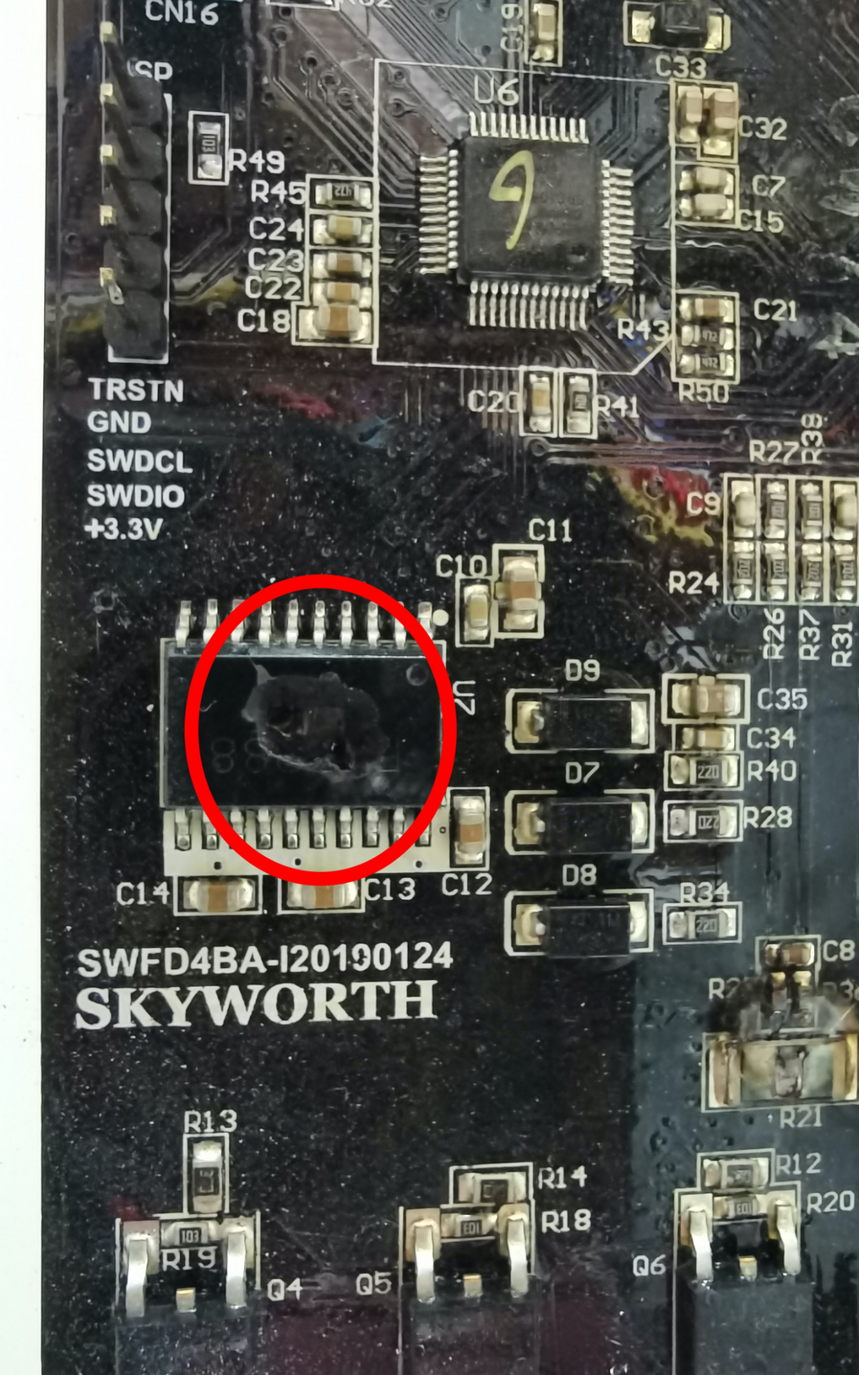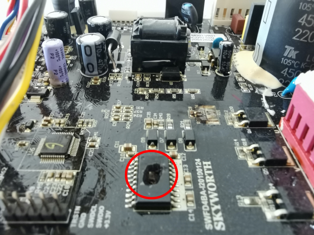 ▲電冰箱的電路主板被燒壞,表面出現(xiàn)一個窟窿