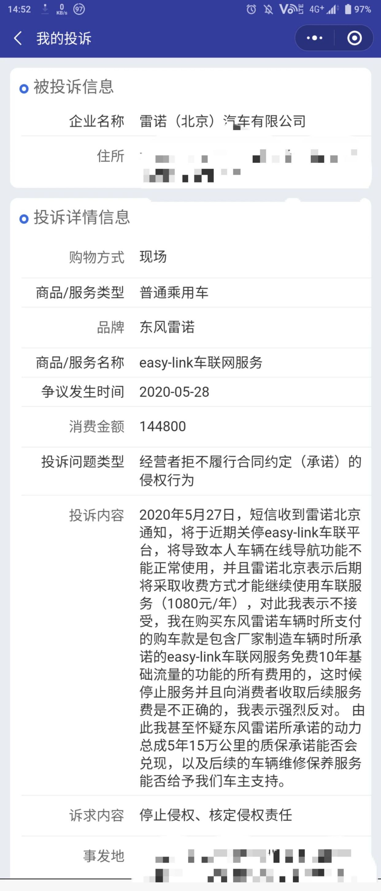 ▲車主就雷諾車載系統(tǒng)停用問題向12315投訴