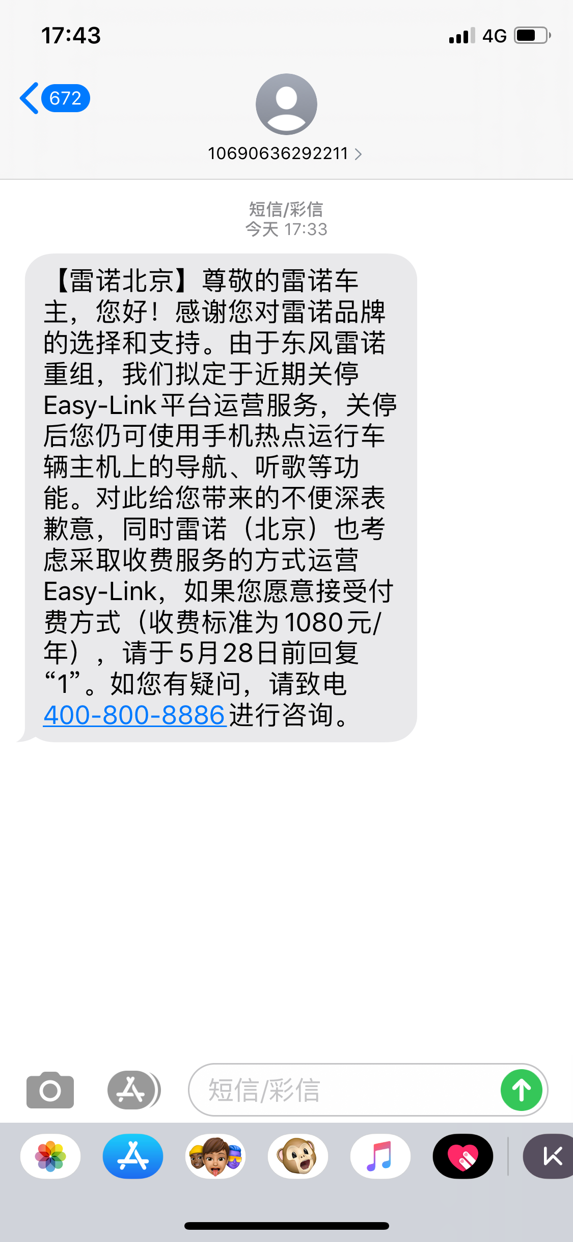 ▲雷諾(北京)短信通知車主將關(guān)停Easy-Link平臺并即將收費(fèi)運(yùn)營