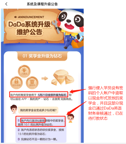 李女士告訴 《消費者報道》,除了獲贈主修課的活動外,家長們還可以參加能獲贈“獎學金”的活動。按要求參加活動后,獎學金就會直接打入家長的噠噠會員賬戶中,還可直接提現。如果有些家長沒能及時將獎學金提現,那么在此次“升級”中,賬戶內已激活及提現進程中的獎學金就會按照10:1的比例被轉為 “鉆石”。值得一提的是,家長的會員賬戶是設有密碼的。可提現的獎學金轉成不值錢的“鉆石”,噠噠英語此舉一出,被很多家長形容為“強行侵入個人賬戶”。