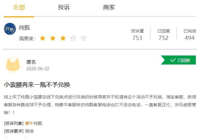 《消費(fèi)者報(bào)道》了解到,“再來(lái)一瓶”的獎(jiǎng)勵(lì)需在蒙牛純甄官方指定的門(mén)店進(jìn)行兌換,但有不少消費(fèi)者反映蒙牛純甄所指定的門(mén)店實(shí)際不存在、商家不愿意兌換等問(wèn)題。本刊通過(guò)黑貓投訴平臺(tái)檢索發(fā)現(xiàn),蒙牛純甄的相關(guān)投訴達(dá)753宗,主要投訴為“再來(lái)一瓶”的獎(jiǎng)勵(lì)無(wú)法兌換。