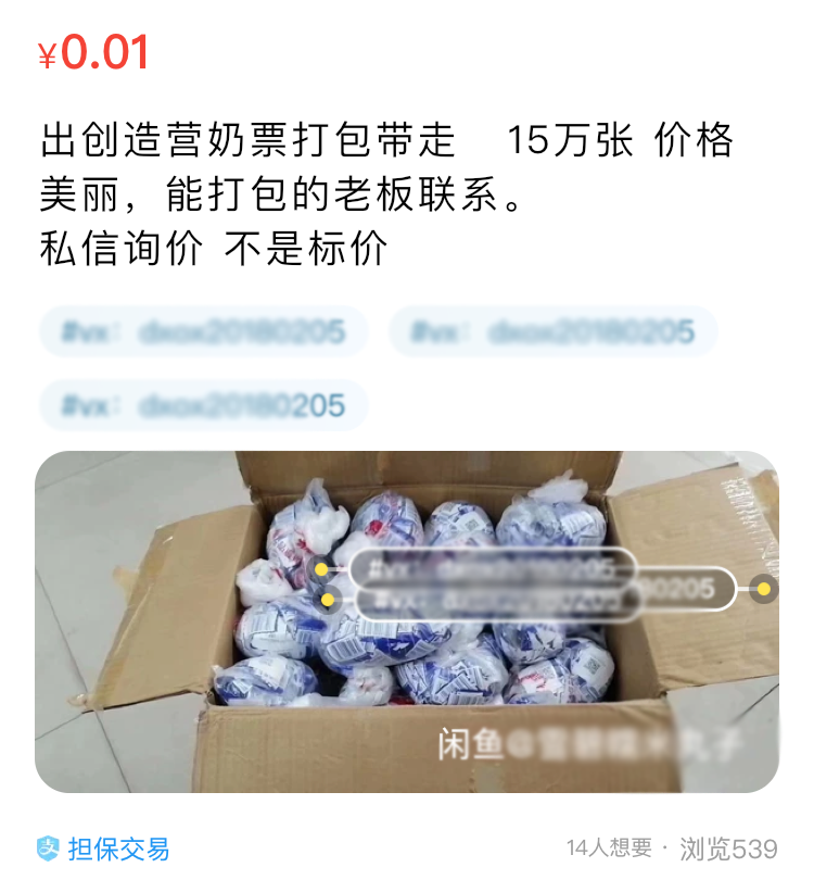 對(duì)此,本刊通過(guò)閑魚(yú)二手平臺(tái)檢索發(fā)現(xiàn),平臺(tái)上除了低價(jià)售賣(mài)大量被割開(kāi)二維碼的蒙牛純甄小蠻腰外,還有個(gè)別用戶販賣(mài)大量的二維碼,其內(nèi)容宣稱純甄二維碼(又稱“奶票”)的數(shù)量高達(dá)幾十萬(wàn)張,面向消費(fèi)群體主要為后援會(huì)、經(jīng)紀(jì)公司及粉絲團(tuán)體。