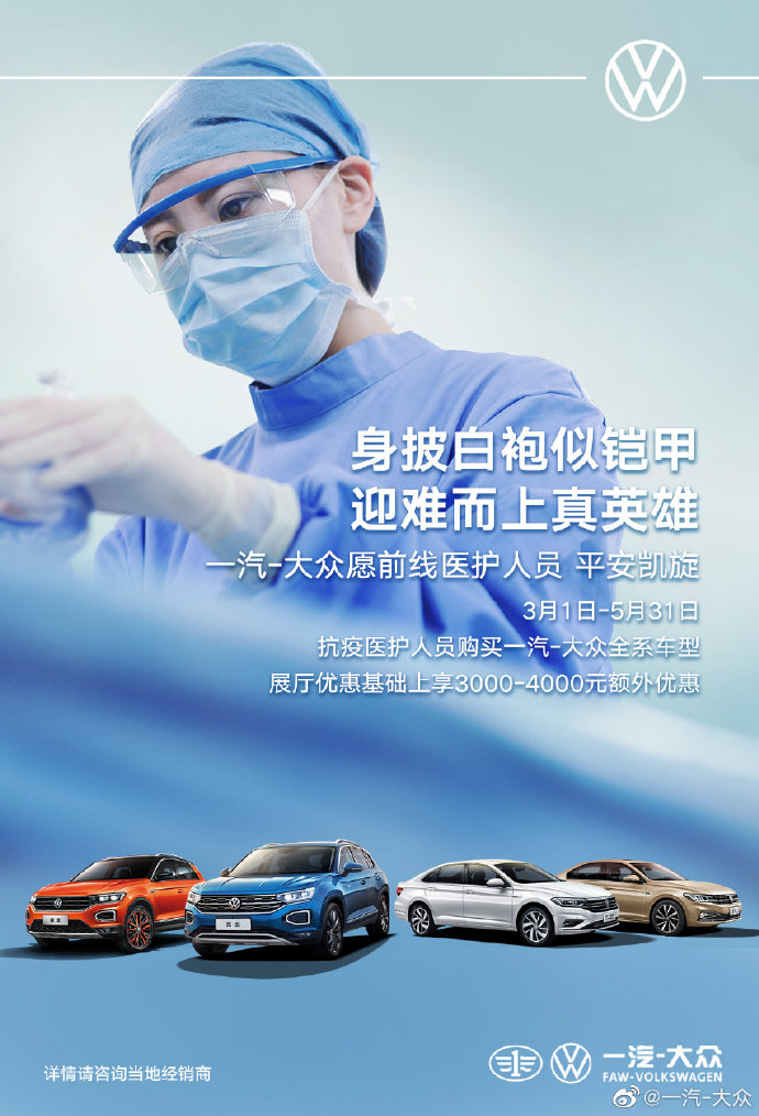 ▲一汽-大眾推出的醫(yī)護(hù)人員專屬優(yōu)惠活動(dòng)(來源:微博@一汽-大眾)