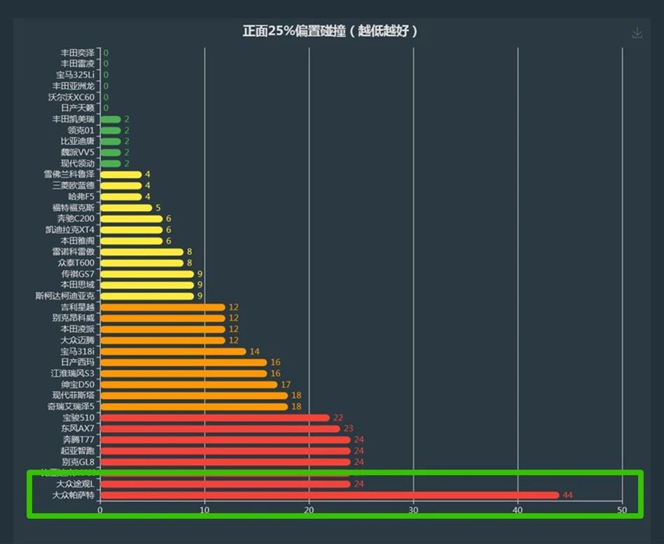 在2019年底公布的中國保險汽車安全指數(shù)(C-IASI)測試結(jié)果中,上汽大眾帕薩特在正面25%偏置碰撞測試中取得最低的P(較差)評級,成為C-IASI正面25%偏置測試中成績墊底的車型,而排在倒數(shù)第二位的是同樣來自上汽大眾的中型SUV途觀L。