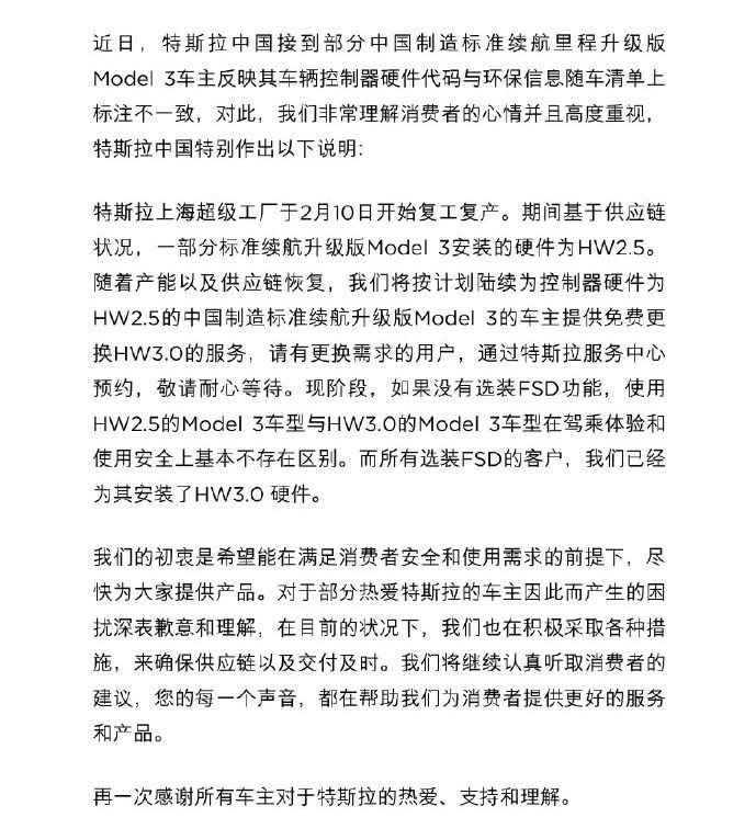 對此,特斯拉在官方微博回應(yīng)稱:“特斯拉上海超級工廠于2月10日開始復(fù)工復(fù)產(chǎn)。期間基于供應(yīng)鏈狀況,一部分標準續(xù)航升級版Model 3安裝的硬件為HW2.5?!碧厮估€承諾為使用HW2.5自動駕駛芯片的車主免費將芯片升級為HW3.0芯片。不過,隨后特斯拉隨后改口,稱只有額外花費56000元安裝了完全自動駕駛計算機(FSD)后才能免費升級芯片。