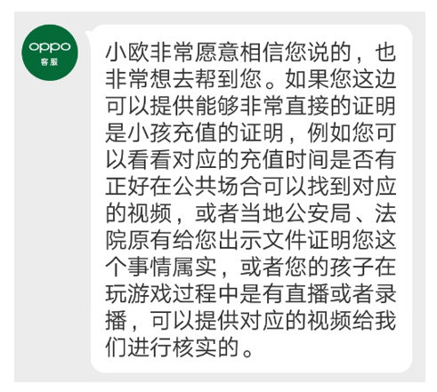 ▲oppo客服需要譚女士提供能證明小孩充值的視頻