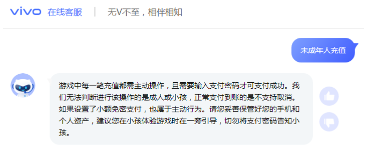 針對(duì)未成年人充值情況,vivo的在線客服對(duì)于未成年充值的問(wèn)題有著整齊劃一的答復(fù):