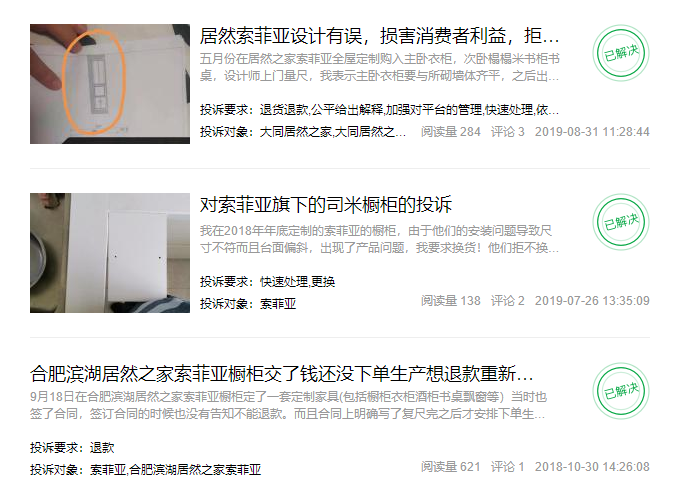 數(shù)量過多的加盟店和經(jīng)銷商,使不小家居定制企業(yè)的門店徒有大品牌的虛名,卻沒有相應的高質(zhì)量產(chǎn)品和服務。在聚投訴和黑貓投訴等消費投訴平臺上,關于裝修公司產(chǎn)品存在質(zhì)量問題、設計與實體不符、裝修人員不執(zhí)行約定工期、經(jīng)銷商跑路的投訴比比皆是:
