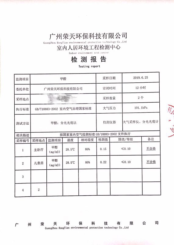 今年6月,阮小姐的孩子已經(jīng)臨近開學,但是房屋里面的異味依然沒有散去。為了證明好萊客提供的家具甲醛超標,阮小姐找到了3家檢測公司對房屋空氣中的甲醛進行檢測,3家公司的檢測結果均顯示甲醛數(shù)值不合格。