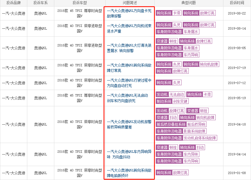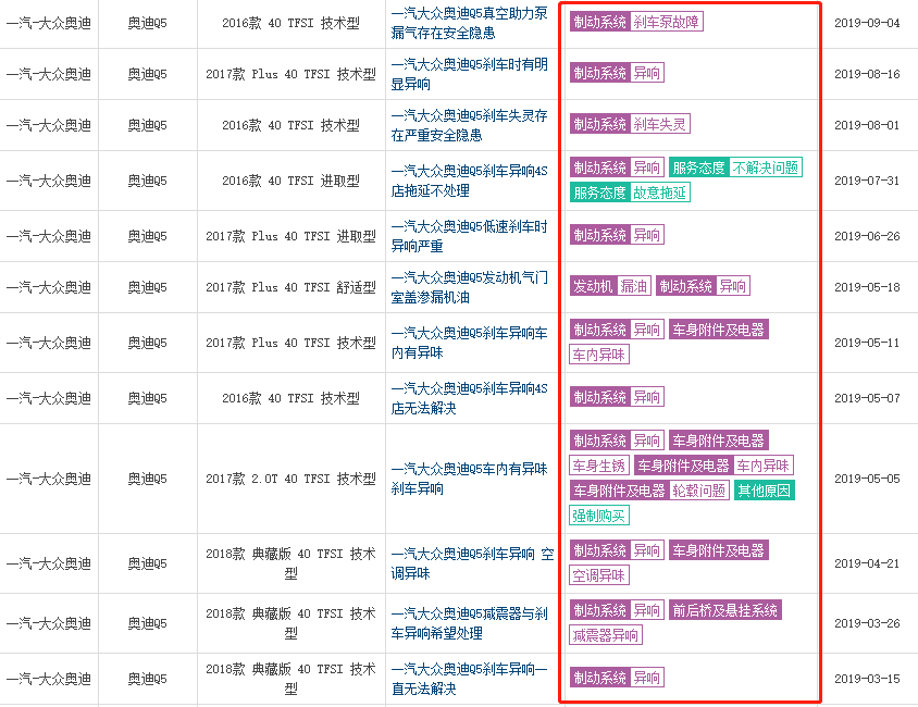 奧迪Q5L屢因質(zhì)量問題被投訴