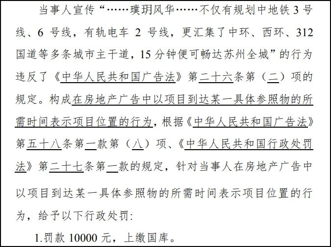 根據(jù)蘇州市虎丘區(qū)市場監(jiān)督管理局2019年3月29日公布的行政處罰決定書顯示,其在微信公眾號宣傳“同步頂級豪宅 落子城心天賦貴脈”、“打造 YUE 空間----蘇州首個“聲音與內(nèi)容”IP 的復(fù)合型生活方式空間”沒有相關(guān)依據(jù),構(gòu)成在廣告中使用絕對化用語的行為。