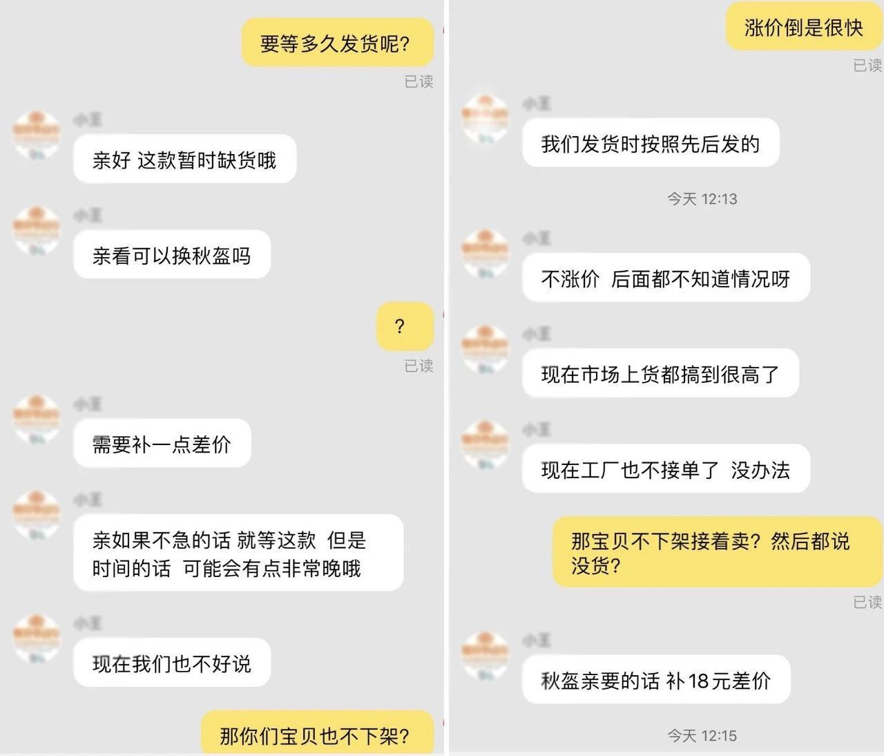 “當(dāng)時便宜入手的頭盔不發(fā)貨,客服稱沒有貨了逼我退款,然后就漲價?!蔽挥?a href="http://qinshanghan.cn/index.php?c=tags&id=2508" target="_self">江西南昌的王佳(化名)對《消費者報道》說。據(jù)了解,王佳在淘寶平臺以37.9元購買了一款電動車頭盔,但最后被客服告知該款頭盔暫時缺貨,可補差價更換另一款頭盔。