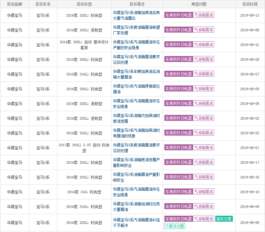 不過,從2018年1月的召回公告的內(nèi)容中可以發(fā)現(xiàn),當(dāng)時的召回范圍為“2015年9月1日至2015年10月31日期間生產(chǎn)的部分華晨寶馬316i、316Li、320i、320Li、328i、328Li、335Li汽車”,而寶馬3系的2016款汽車并不在當(dāng)時的召回范圍之內(nèi),現(xiàn)在卻同樣出現(xiàn)了多起關(guān)于燃油箱漏油的投訴。