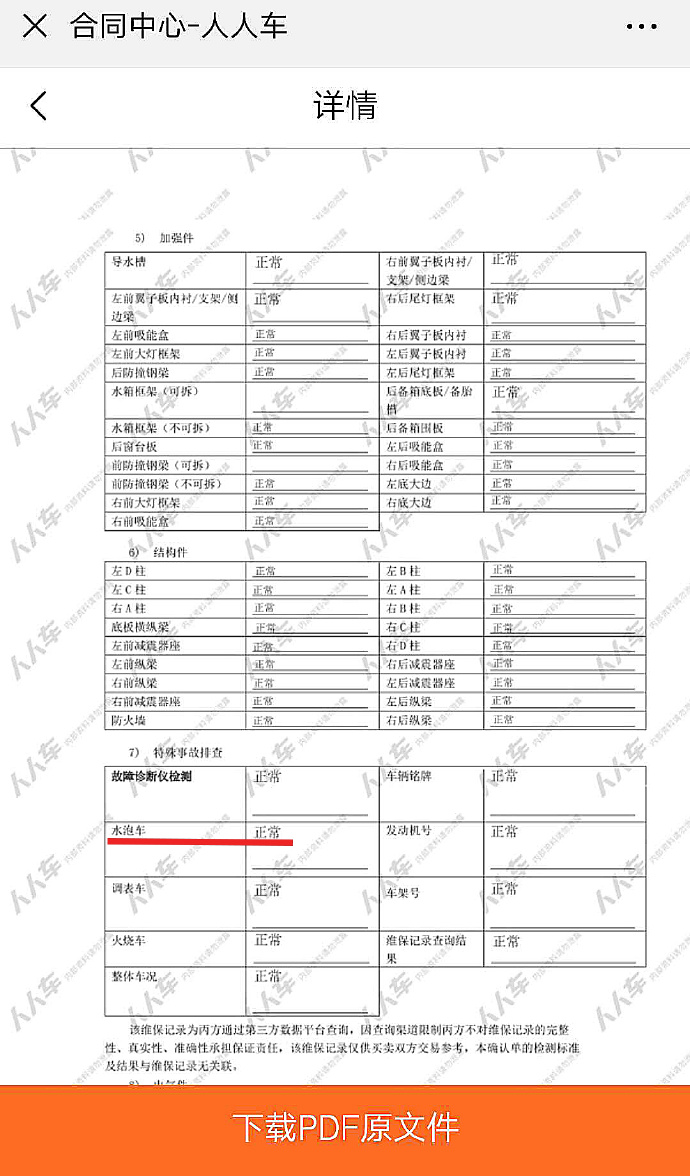 本刊查看人人車12月1日出具的《復(fù)檢確認(rèn)書》顯示除“左右燈更換、車身線舒束更換,前杠劃痕,右前門凹陷,后杠刮痕”外,其余正常,特殊事故排查中,無“水泡”現(xiàn)象。