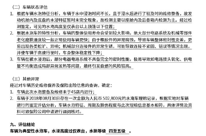 2019年1月10日下午,投訴人前往第三方平臺北京堅實舊機動車鑒定評估有限公司車跑分機動車檢測服務中心進行整車檢測,檢測報告顯示,該車為嚴重水泡車,水泡級別為四級到五級。