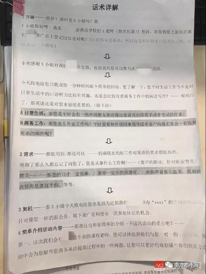 ??某成人英語培訓(xùn)機構(gòu)銷售人員所用的《話術(shù)詳解》。銷售人員在問到客戶職業(yè)時會套用一些贊美的話。