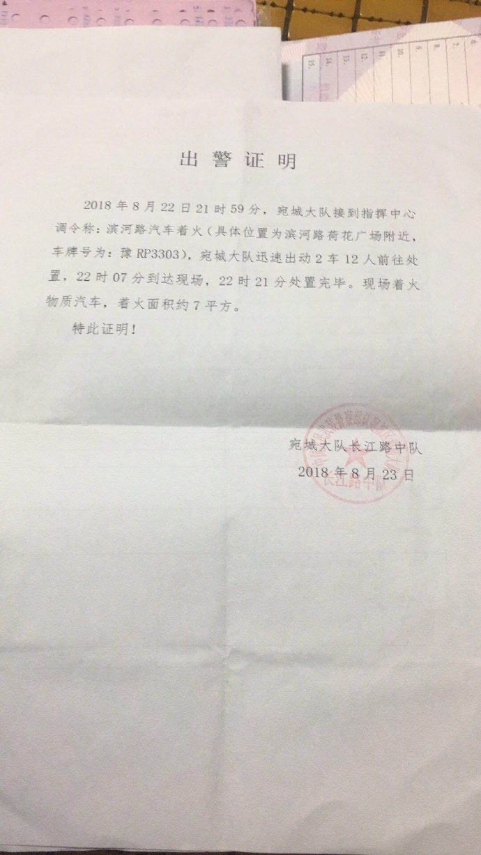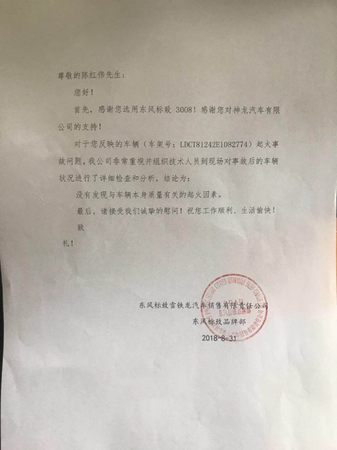 當(dāng)?shù)叵啦块T和交警部門也對(duì)該起事故出具了《出警證明》,證明陳先生駕駛的標(biāo)致3008轎車系自燃起火。