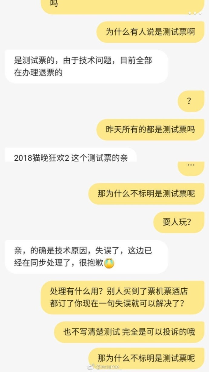 超過300名消費(fèi)者10月29日在大麥網(wǎng)確認(rèn)和搶購的“2018貓晚狂歡2”門票,于10月30日下午被直接退票,大麥網(wǎng)的理由先是因技術(shù)失誤為測試票,后改口為無票發(fā)貨?!皼]有收到任何通知,大麥網(wǎng)單方面退款,可我們機(jī)票、酒店都訂好了……”不止一個消費(fèi)者在微博私信《消費(fèi)者報道》(英文簡稱“CCR”),控訴大麥網(wǎng)出爾反爾,導(dǎo)致利益受損。