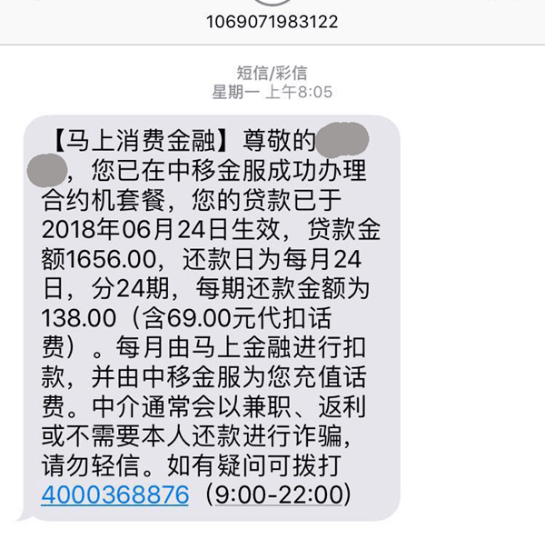 藤縣唐小姐告訴消費者報道,待她拿回手機后才發(fā)現(xiàn)有一條“您已在中移金服成功辦理合約機套餐,貸款金額1656元,分24期還款,每月還款金額為138元(含69元代扣話費)。由馬上金融進行扣款,中移金服充值話費”的短信。