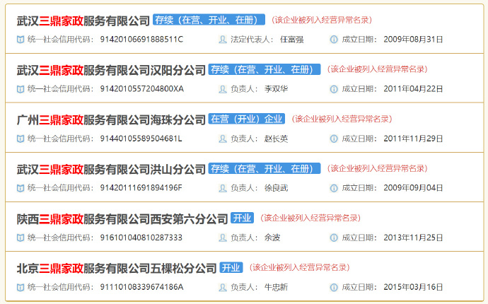 國家企業(yè)信用公示系統(tǒng)顯示,三鼎家政多次因“通過登記的住所或者經(jīng)營場所無法聯(lián)系”被工商部門列入經(jīng)營異常名錄。解放日報曾報道,三鼎家政自稱在上海有32家直營分店,然而實際具有營業(yè)執(zhí)照的分支機構(gòu)僅有10家,且目前續(xù)存的僅5家,剩余5家已注銷。