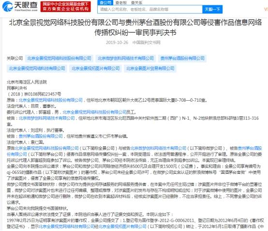 據(jù)天眼查近日更新的最新消息顯示,北京市海淀區(qū)人民法院于2018年10月26日判決了北京市海淀區(qū)人民法院受理了原告全景網(wǎng)絡(luò)與被告北京微夢(mèng)創(chuàng)科網(wǎng)絡(luò)技術(shù)有限公司(簡(jiǎn)稱“微夢(mèng)公司”)、被告貴州茅臺(tái)侵害作品信息網(wǎng)絡(luò)傳播權(quán)糾紛一案,判決書文號(hào)為(2018)京0108民初23457號(hào)。