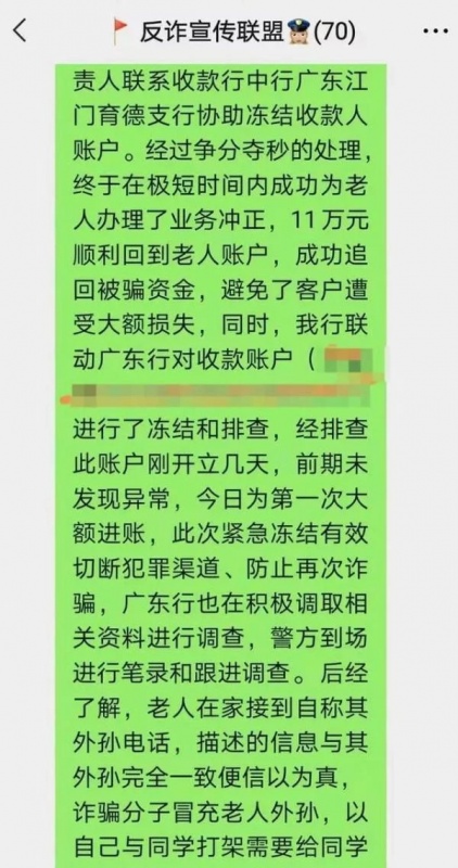內(nèi)控副職袁蓉和柜員孫瑞潔想方設(shè)法進(jìn)行資金追回,廳堂人員協(xié)助老人撥打110報(bào)警,負(fù)責(zé)人聯(lián)系收款行中行廣東江門育德支行協(xié)助凍結(jié)收款人賬戶。