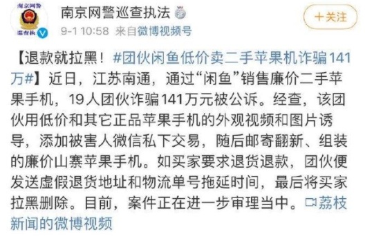 9月1日,南京網(wǎng)警巡查執(zhí)法微博發(fā)布消息,近日,在江蘇南通,一個(gè)19人團(tuán)伙,通過阿里旗下閑置交易社區(qū)閑魚銷售廉價(jià)二手蘋果手機(jī),詐騙141萬元被公訴。