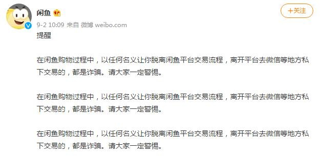 閑魚是阿里旗下閑置交易社區(qū)。9月2日上午,閑魚在微博發(fā)布提醒稱,在閑魚購物過程中,以任何名義讓你脫離閑魚平臺(tái)交易流程,離開平臺(tái)去微信等平臺(tái)私下交易的都是詐騙。