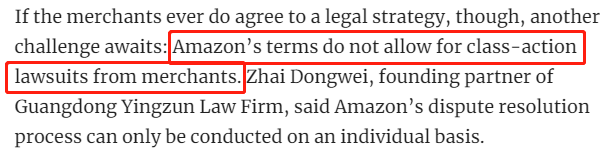 亞馬遜從入駐政策上就白紙黑字設(shè)置了霸王條款,切斷了賣家集體訴訟就是其中一項(xiàng)。