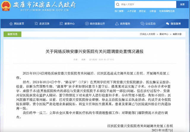 今天(10月7日)中午,安康市漢濱區(qū)人民政府官網(wǎng)再發(fā)通報(bào)稱,經(jīng)查,10月4日中午,“路某甲”(17歲)在其同學(xué)陪同下到安康興安醫(yī)院就診,醫(yī)生操某某接診、檢查,診斷為宮頸贅生物,“路某甲”在手術(shù)知情同意書上簽字后,操某某對其實(shí)施了手術(shù)。不存在手術(shù)中簽字、虛假手術(shù)(在其他醫(yī)院檢查的部位與安康興安醫(yī)院手術(shù)部位不是同一部位)問題。通報(bào)顯示,但在診療過程中,安康興安醫(yī)院在沒有監(jiān)護(hù)人陪同、簽字的情況下對未成年人進(jìn)行檢查和手術(shù),存在管理不規(guī)范、告知不到位、醫(yī)風(fēng)醫(yī)德不端正等問題。
