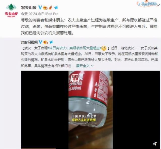 農(nóng)夫山泉回應(yīng)未開封瓶裝水現(xiàn)蛆蟲,農(nóng)夫山泉已報警