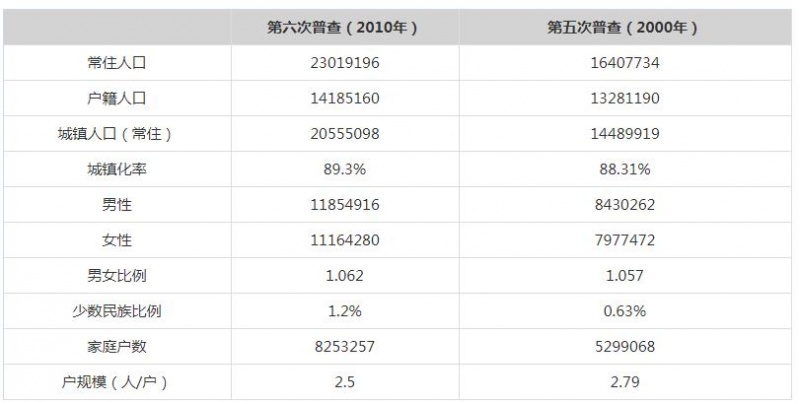 民族人口:全市常住人口中,漢族人口為24471085人,占98.4%;各少數(shù)民族人口為399810人,占1.6%。與2010年第六次全國人口普查相比,漢族人口增加1728052人,增長7.6%;各少數(shù)民族人口增加123647人,增長44.8%。