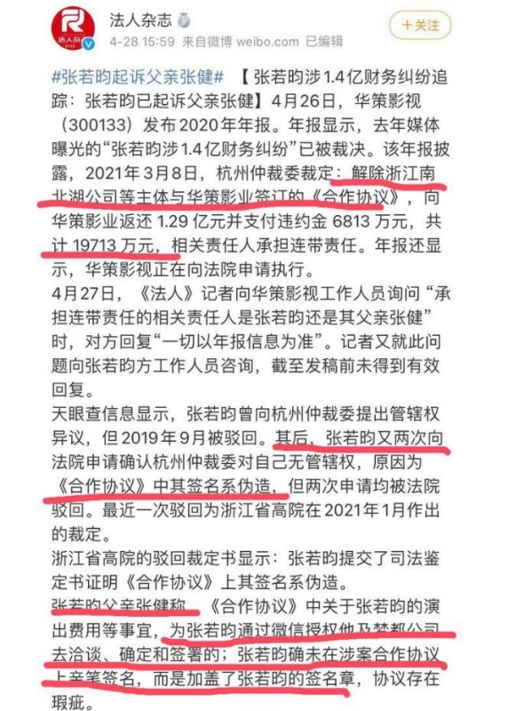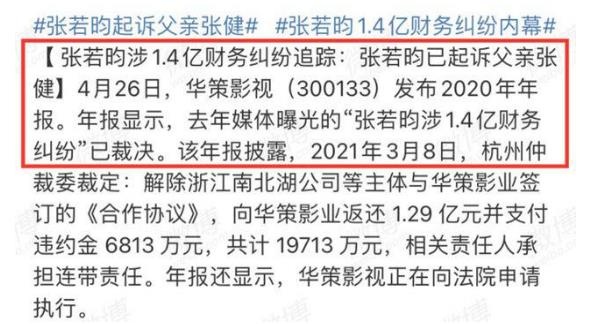 張健一手抓住浙江夢(mèng)都和張若昀的經(jīng)紀(jì)約,一手抓住夢(mèng)舟系公司搞資本運(yùn)作,曾一度風(fēng)光無(wú)限。張若昀與華策之間的 4 部戲合約,是通過(guò)父親張健簽訂,但因張若昀拒不參演,藝人不配合導(dǎo)致雙方合作擱淺,張若昀陷入 1.4 億元違約糾紛,于今年四月正式起訴父親張健。