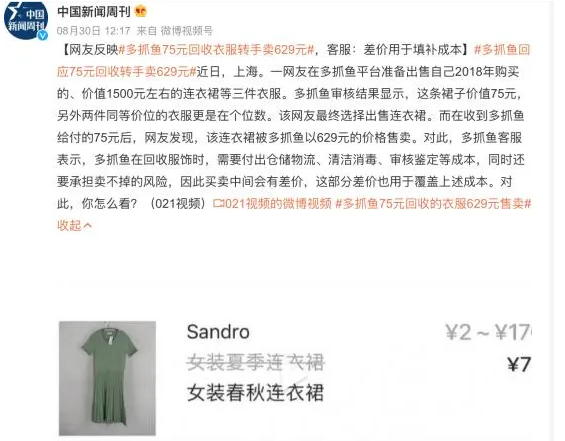 近日,上海。一網(wǎng)友在多抓魚平臺準(zhǔn)備出售自己2018年購買的、價值1500元左右的連衣裙等三件衣服。多抓魚審核結(jié)果顯示,這條裙子價值75元,另外兩件同等價位的衣服更是在個位數(shù)。該網(wǎng)友最終選擇出售連衣裙。而在收到多抓魚給付的75元后,網(wǎng)友發(fā)現(xiàn),該連衣裙被多抓魚以629元的價格售賣。對此,多抓魚客服表示,多抓魚在回收服飾時,需要付出倉儲物流、清潔消毒、審核鑒定等成本,同時還要承擔(dān)賣不掉的風(fēng)險,因此買賣中間會有差價,這部分差價也用于覆蓋上述成本,