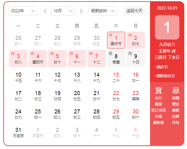 2022年國慶節(jié)放假時間安排:2022年10月1日(周六)-2022年10月7日(周五),共放假7天,其中2022年10月8日(周六)和2022年10月9日(周日)為正常上班調(diào)休時間。