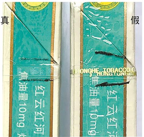 煙盒拉帶頭形狀與印刷文字差異對(duì)比:真煙拉帶頭是規(guī)則的小半圓形,對(duì)稱光滑;假煙拉帶頭是不規(guī)則的半橢圓形,彎曲弧度不對(duì)稱。真煙拉帶上印有藍(lán)色“家園”字樣,假煙的文字則為黃色英文字母。(潘怡馨 周慧華)